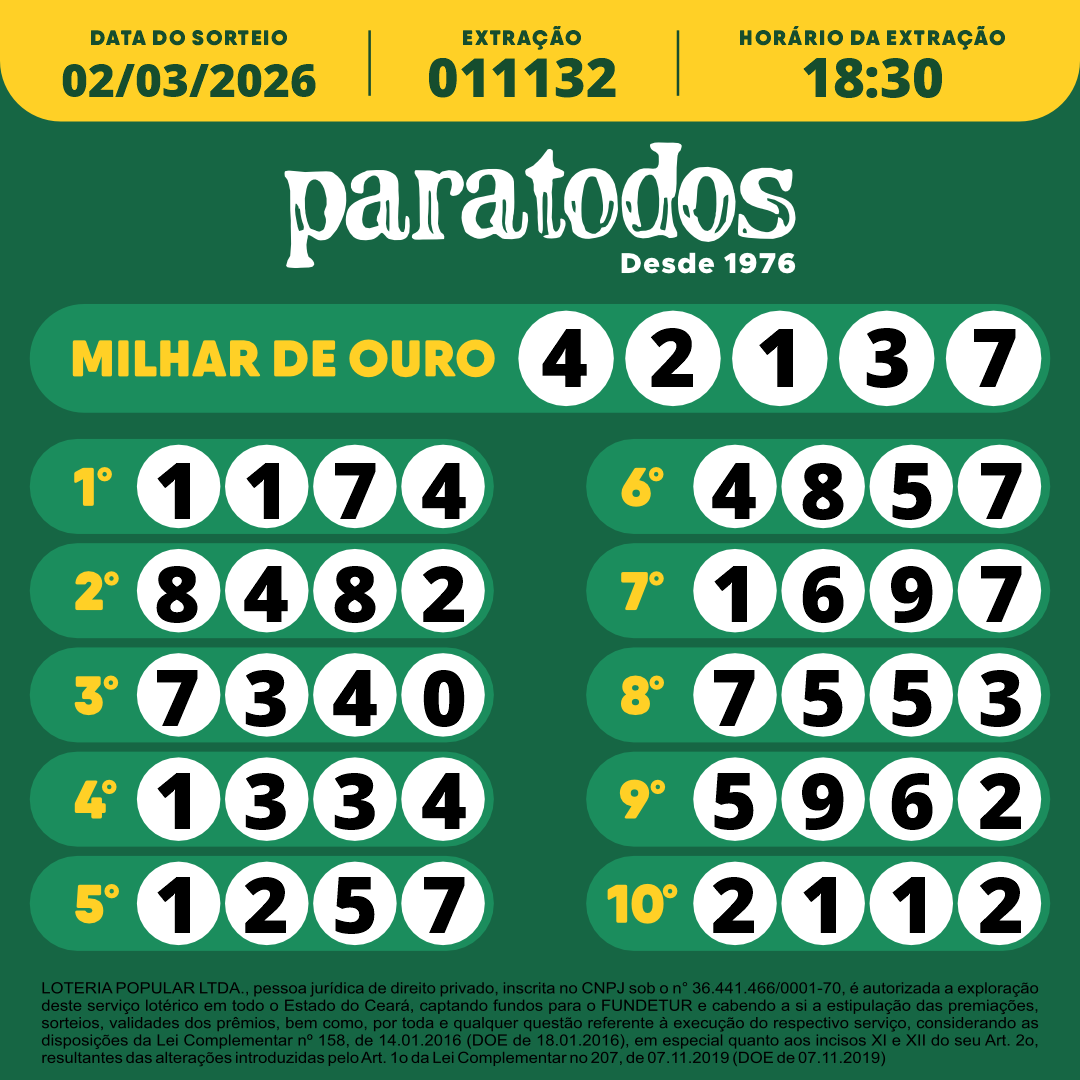 NÚMEROS SORTEADOS – 02/03/2026 – 15:45