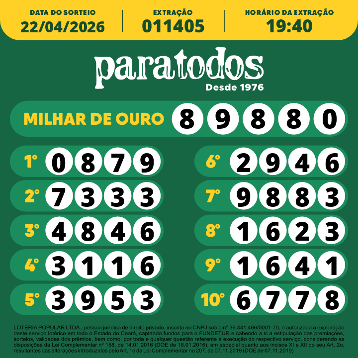 LOTERIA POPULAR LTDA., pessoa jurídica de direito privado, inscrita no CNPJ sob o n° 36.441.466/0001-70, é autorizada a exploração deste serviço lotérico em todo o Estado do Ceará, captando fundos para o FUNDETUR e cabendo a si a estipulação das premiações, sorteios, validades dos prêmios, bem como por toda e qualquer questão referente à execução do respectivo serviço, considerando as disposições da Lei Complementar nº 158, de 14.01.2016 (DOE de 18.01.2016), em especial quanto aos incisos XI e XII do seu Art. 2o, resultantes das alterações introduzidas pelo Art. 1o da Lei Complementar no 207, de 07.11.2019 (DOE de 07.11.2019)