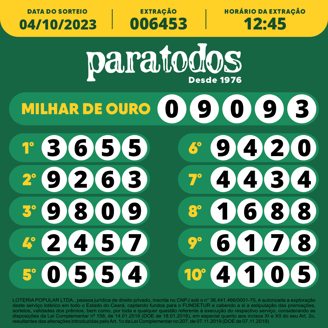 NÚMEROS SORTEADOS – 04/10/2023 – 12:45