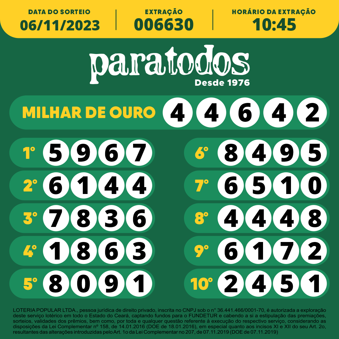 NÚMEROS SORTEADOS – 06/11/2023 – 10:45