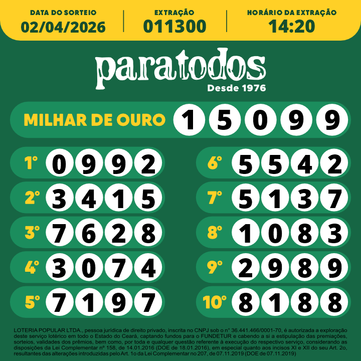 LOTERIA POPULAR LTDA., pessoa jurídica de direito privado, inscrita no CNPJ sob o n° 36.441.466/0001-70, é autorizada a exploração deste serviço lotérico em todo o Estado do Ceará, captando fundos para o FUNDETUR e cabendo a si a estipulação das premiações, sorteios, validades dos prêmios, bem como por toda e qualquer questão referente à execução do respectivo serviço, considerando as disposições da Lei Complementar nº 158, de 14.01.2016 (DOE de 18.01.2016), em especial quanto aos incisos XI e XII do seu Art. 2o, resultantes das alterações introduzidas pelo Art. 1o da Lei Complementar no 207, de 07.11.2019 (DOE de 07.11.2019)