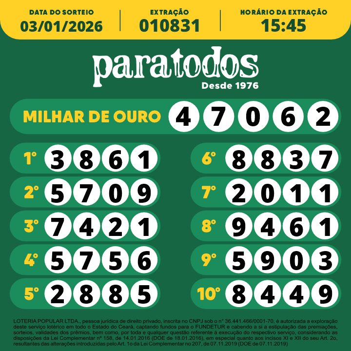 LOTERIA POPULAR LTDA., pessoa jurídica de direito privado, inscrita no CNPJ sob o n° 36.441.466/0001-70, é autorizada a exploração deste serviço lotérico em todo o Estado do Ceará, captando fundos para o FUNDETUR e cabendo a si a estipulação das premiações, sorteios, validades dos prêmios, bem como por toda e qualquer questão referente à execução do respectivo serviço, considerando as disposições da Lei Complementar nº 158, de 14.01.2016 (DOE de 18.01.2016), em especial quanto aos incisos XI e XII do seu Art. 2o, resultantes das alterações introduzidas pelo Art. 1o da Lei Complementar no 207, de 07.11.2019 (DOE de 07.11.2019)