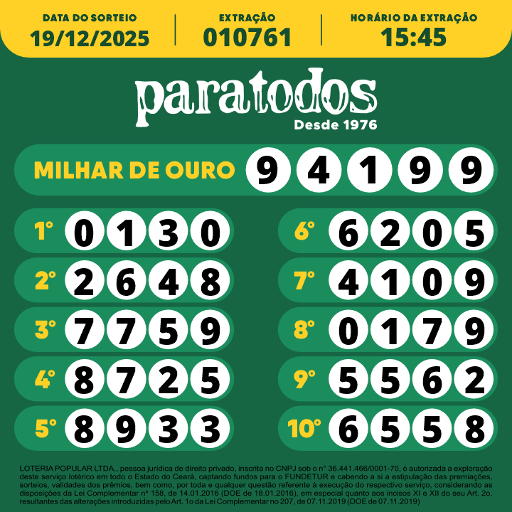 LOTERIA POPULAR LTDA., pessoa jurídica de direito privado, inscrita no CNPJ sob o n° 36.441.466/0001-70, é autorizada a exploração deste serviço lotérico em todo o Estado do Ceará, captando fundos para o FUNDETUR e cabendo a si a estipulação das premiações, sorteios, validades dos prêmios, bem como por toda e qualquer questão referente à execução do respectivo serviço, considerando as disposições da Lei Complementar nº 158, de 14.01.2016 (DOE de 18.01.2016), em especial quanto aos incisos XI e XII do seu Art. 2o, resultantes das alterações introduzidas pelo Art. 1o da Lei Complementar no 207, de 07.11.2019 (DOE de 07.11.2019)