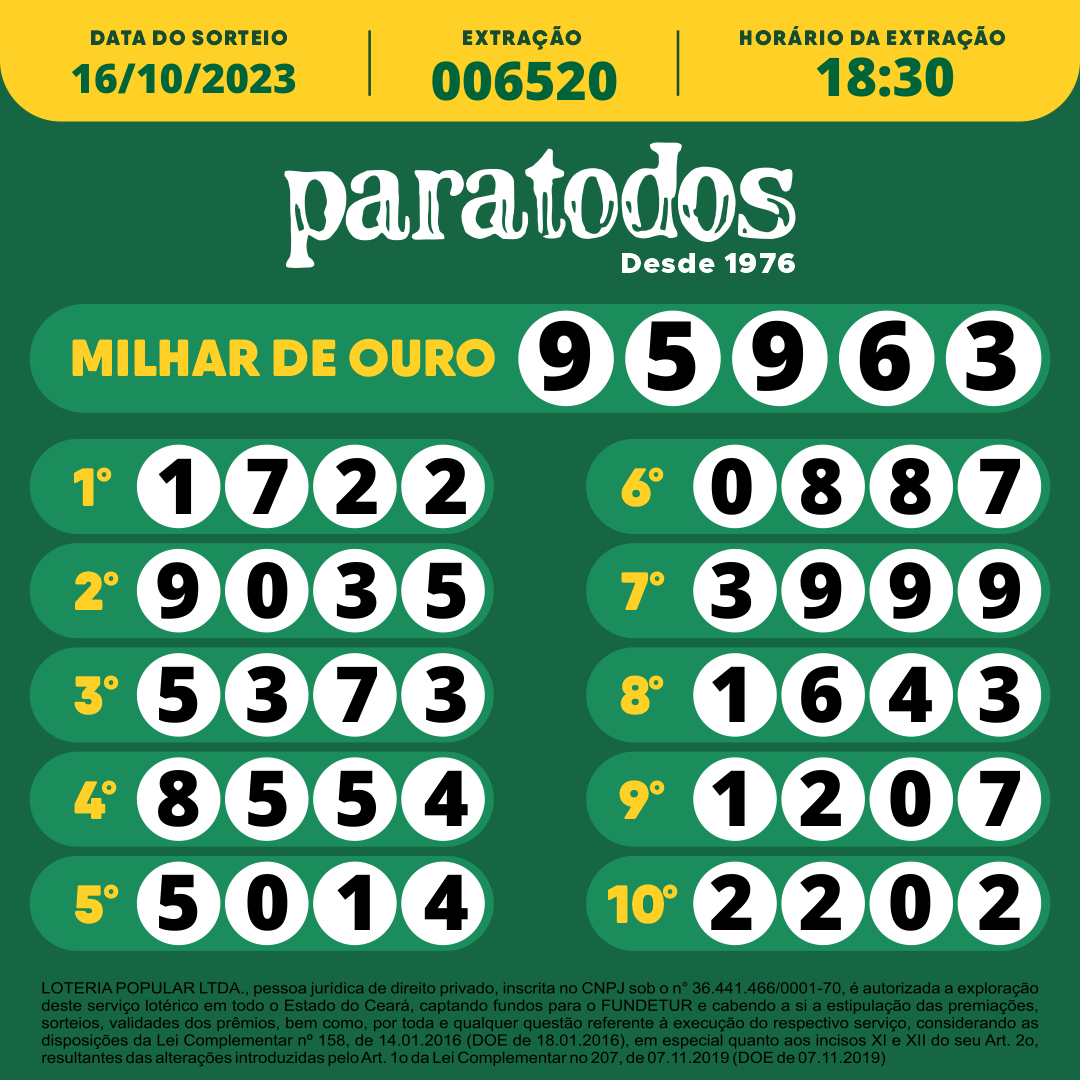 NÚMEROS SORTEADOS – 16/10/2023 – 18:30