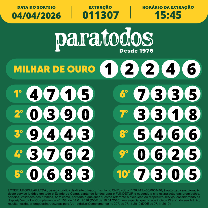 LOTERIA POPULAR LTDA., pessoa jurídica de direito privado, inscrita no CNPJ sob o n° 36.441.466/0001-70, é autorizada a exploração deste serviço lotérico em todo o Estado do Ceará, captando fundos para o FUNDETUR e cabendo a si a estipulação das premiações, sorteios, validades dos prêmios, bem como por toda e qualquer questão referente à execução do respectivo serviço, considerando as disposições da Lei Complementar nº 158, de 14.01.2016 (DOE de 18.01.2016), em especial quanto aos incisos XI e XII do seu Art. 2o, resultantes das alterações introduzidas pelo Art. 1o da Lei Complementar no 207, de 07.11.2019 (DOE de 07.11.2019)