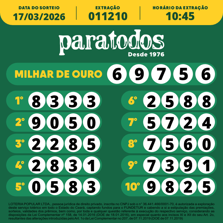 LOTERIA POPULAR LTDA., pessoa jurídica de direito privado, inscrita no CNPJ sob o n° 36.441.466/0001-70, é autorizada a exploração deste serviço lotérico em todo o Estado do Ceará, captando fundos para o FUNDETUR e cabendo a si a estipulação das premiações, sorteios, validades dos prêmios, bem como por toda e qualquer questão referente à execução do respectivo serviço, considerando as disposições da Lei Complementar nº 158, de 14.01.2016 (DOE de 18.01.2016), em especial quanto aos incisos XI e XII do seu Art. 2o, resultantes das alterações introduzidas pelo Art. 1o da Lei Complementar no 207, de 07.11.2019 (DOE de 07.11.2019)