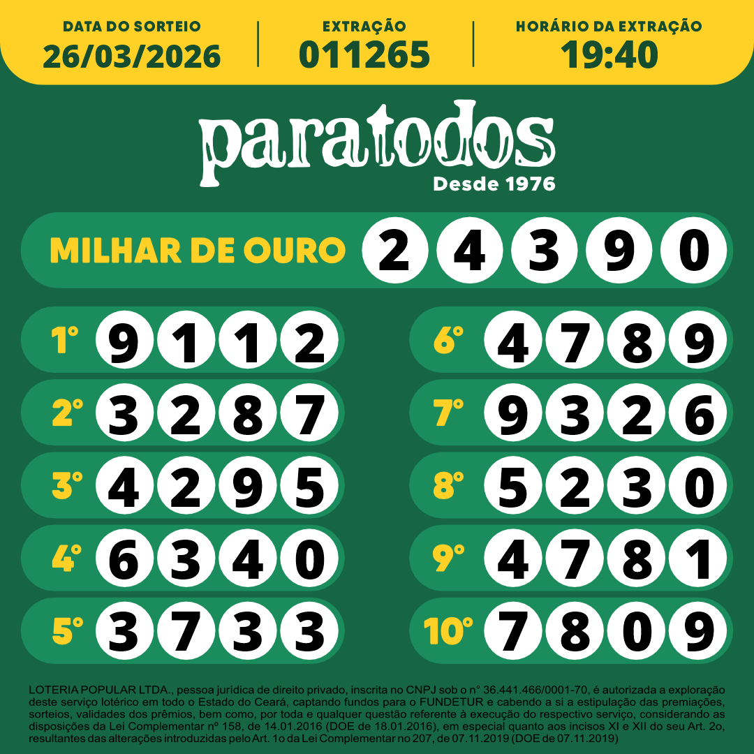 LOTERIA POPULAR LTDA., pessoa jurídica de direito privado, inscrita no CNPJ sob o n° 36.441.466/0001-70, é autorizada a exploração deste serviço lotérico em todo o Estado do Ceará, captando fundos para o FUNDETUR e cabendo a si a estipulação das premiações, sorteios, validades dos prêmios, bem como por toda e qualquer questão referente à execução do respectivo serviço, considerando as disposições da Lei Complementar nº 158, de 14.01.2016 (DOE de 18.01.2016), em especial quanto aos incisos XI e XII do seu Art. 2o, resultantes das alterações introduzidas pelo Art. 1o da Lei Complementar no 207, de 07.11.2019 (DOE de 07.11.2019)