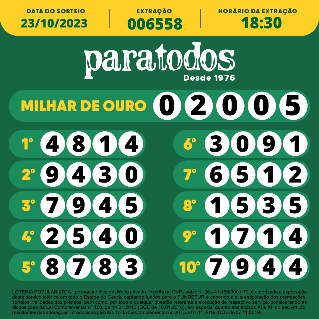 NÚMEROS SORTEADOS – 23/10/2023 – 18:30