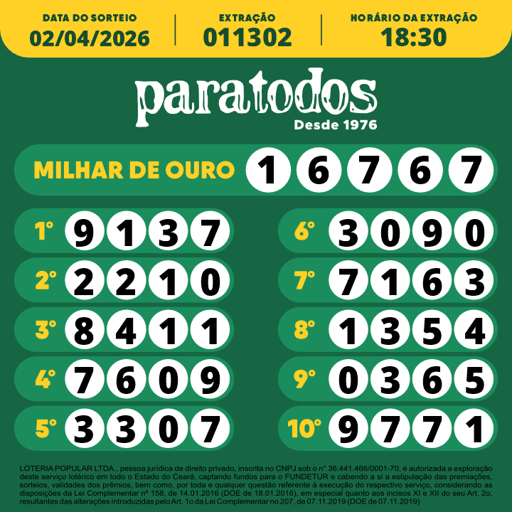 LOTERIA POPULAR LTDA., pessoa jurídica de direito privado, inscrita no CNPJ sob o n° 36.441.466/0001-70, é autorizada a exploração deste serviço lotérico em todo o Estado do Ceará, captando fundos para o FUNDETUR e cabendo a si a estipulação das premiações, sorteios, validades dos prêmios, bem como por toda e qualquer questão referente à execução do respectivo serviço, considerando as disposições da Lei Complementar nº 158, de 14.01.2016 (DOE de 18.01.2016), em especial quanto aos incisos XI e XII do seu Art. 2o, resultantes das alterações introduzidas pelo Art. 1o da Lei Complementar no 207, de 07.11.2019 (DOE de 07.11.2019)