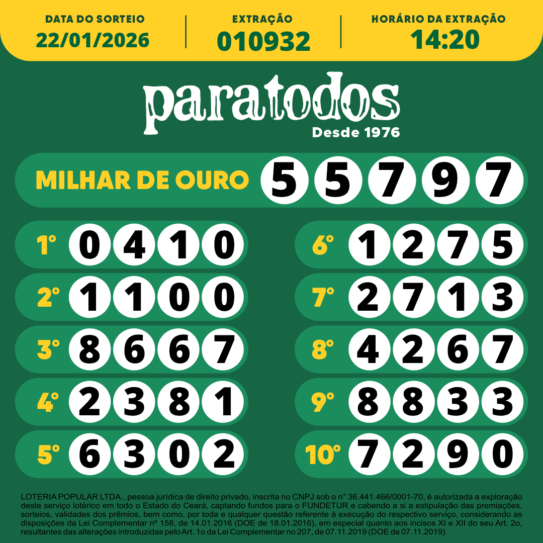 LOTERIA POPULAR LTDA., pessoa jurídica de direito privado, inscrita no CNPJ sob o n° 36.441.466/0001-70, é autorizada a exploração deste serviço lotérico em todo o Estado do Ceará, captando fundos para o FUNDETUR e cabendo a si a estipulação das premiações, sorteios, validades dos prêmios, bem como por toda e qualquer questão referente à execução do respectivo serviço, considerando as disposições da Lei Complementar nº 158, de 14.01.2016 (DOE de 18.01.2016), em especial quanto aos incisos XI e XII do seu Art. 2o, resultantes das alterações introduzidas pelo Art. 1o da Lei Complementar no 207, de 07.11.2019 (DOE de 07.11.2019)
