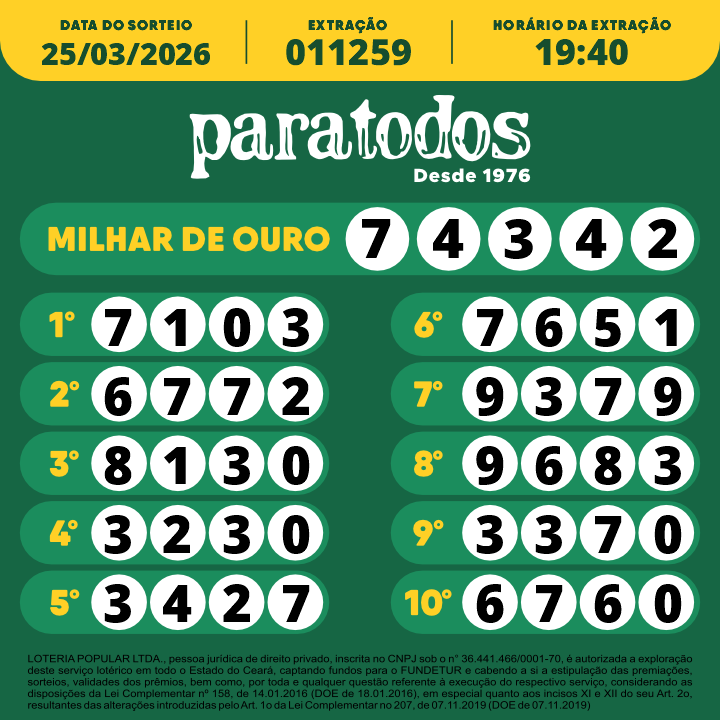 LOTERIA POPULAR LTDA., pessoa jurídica de direito privado, inscrita no CNPJ sob o n° 36.441.466/0001-70, é autorizada a exploração deste serviço lotérico em todo o Estado do Ceará, captando fundos para o FUNDETUR e cabendo a si a estipulação das premiações, sorteios, validades dos prêmios, bem como por toda e qualquer questão referente à execução do respectivo serviço, considerando as disposições da Lei Complementar nº 158, de 14.01.2016 (DOE de 18.01.2016), em especial quanto aos incisos XI e XII do seu Art. 2o, resultantes das alterações introduzidas pelo Art. 1o da Lei Complementar no 207, de 07.11.2019 (DOE de 07.11.2019)