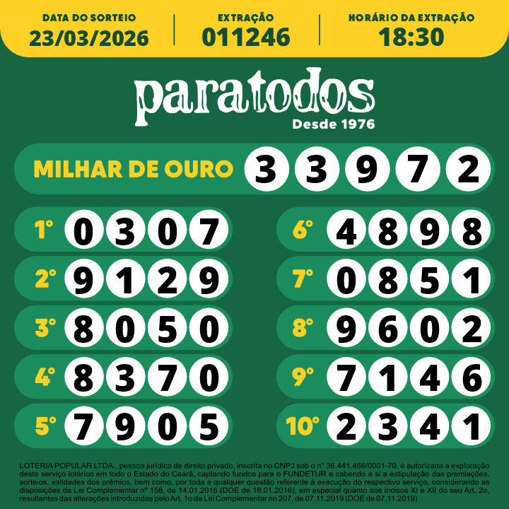 LOTERIA POPULAR LTDA., pessoa jurídica de direito privado, inscrita no CNPJ sob o n° 36.441.466/0001-70, é autorizada a exploração deste serviço lotérico em todo o Estado do Ceará, captando fundos para o FUNDETUR e cabendo a si a estipulação das premiações, sorteios, validades dos prêmios, bem como por toda e qualquer questão referente à execução do respectivo serviço, considerando as disposições da Lei Complementar nº 158, de 14.01.2016 (DOE de 18.01.2016), em especial quanto aos incisos XI e XII do seu Art. 2o, resultantes das alterações introduzidas pelo Art. 1o da Lei Complementar no 207, de 07.11.2019 (DOE de 07.11.2019)
