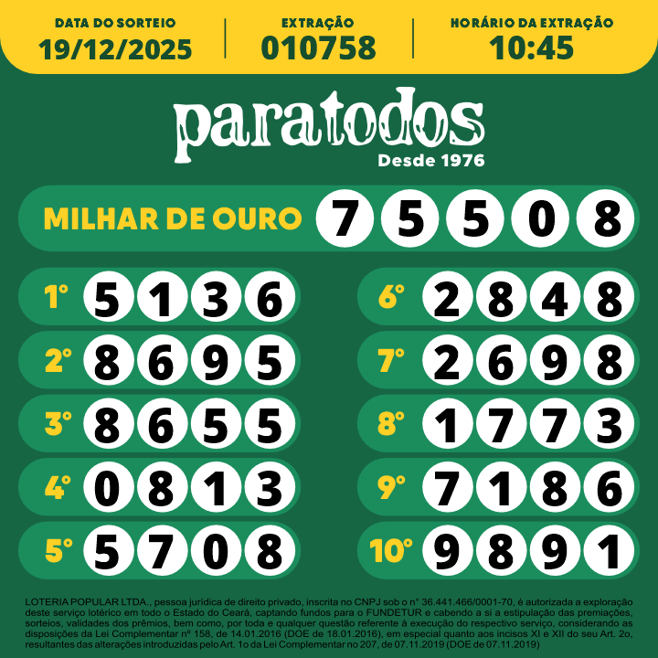 LOTERIA POPULAR LTDA., pessoa jurídica de direito privado, inscrita no CNPJ sob o n° 36.441.466/0001-70, é autorizada a exploração deste serviço lotérico em todo o Estado do Ceará, captando fundos para o FUNDETUR e cabendo a si a estipulação das premiações, sorteios, validades dos prêmios, bem como por toda e qualquer questão referente à execução do respectivo serviço, considerando as disposições da Lei Complementar nº 158, de 14.01.2016 (DOE de 18.01.2016), em especial quanto aos incisos XI e XII do seu Art. 2o, resultantes das alterações introduzidas pelo Art. 1o da Lei Complementar no 207, de 07.11.2019 (DOE de 07.11.2019)