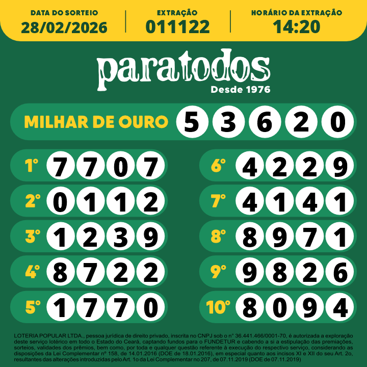 NÚMEROS SORTEADOS – 28/02/2026 – 10:45