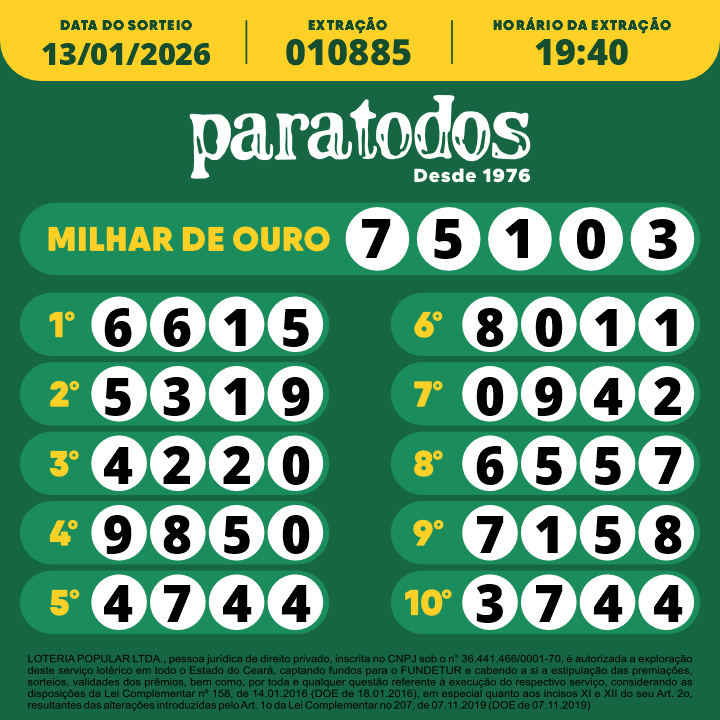 LOTERIA POPULAR LTDA., pessoa jurídica de direito privado, inscrita no CNPJ sob o n° 36.441.466/0001-70, é autorizada a exploração deste serviço lotérico em todo o Estado do Ceará, captando fundos para o FUNDETUR e cabendo a si a estipulação das premiações, sorteios, validades dos prêmios, bem como por toda e qualquer questão referente à execução do respectivo serviço, considerando as disposições da Lei Complementar nº 158, de 14.01.2016 (DOE de 18.01.2016), em especial quanto aos incisos XI e XII do seu Art. 2o, resultantes das alterações introduzidas pelo Art. 1o da Lei Complementar no 207, de 07.11.2019 (DOE de 07.11.2019)
