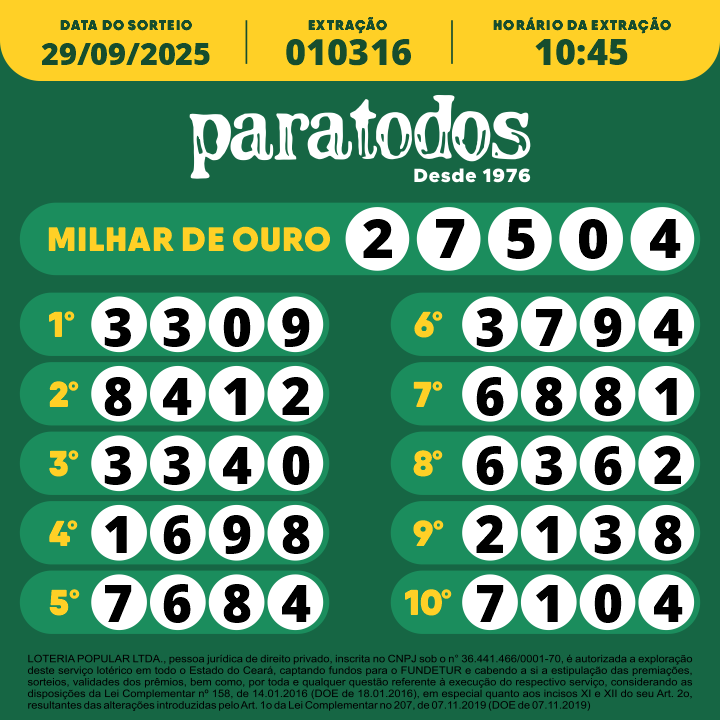 NÚMEROS SORTEADOS – 29/09/2025 – 10:45