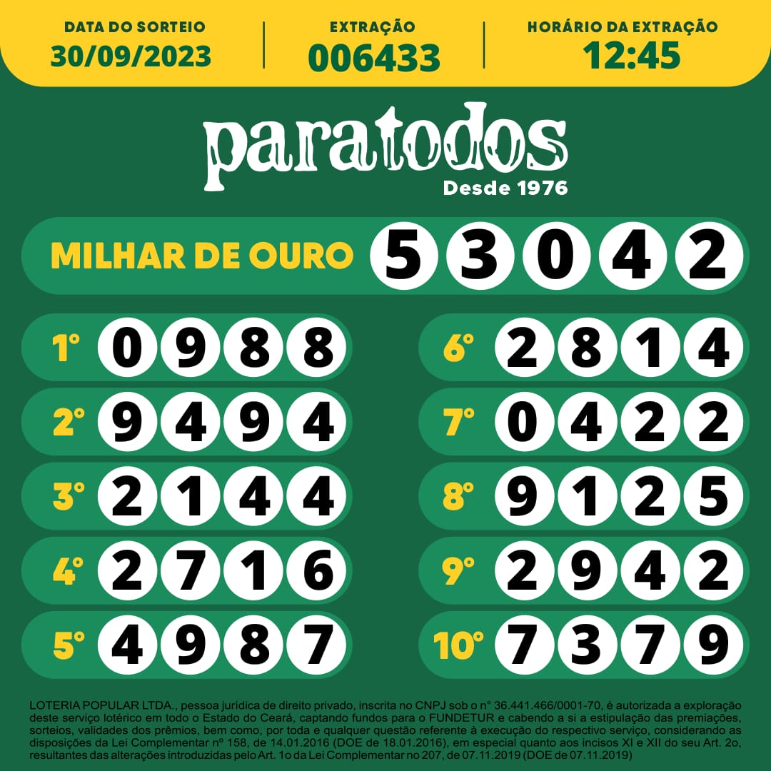 NÚMEROS SORTEADOS – 30/09/2023 – 12:45